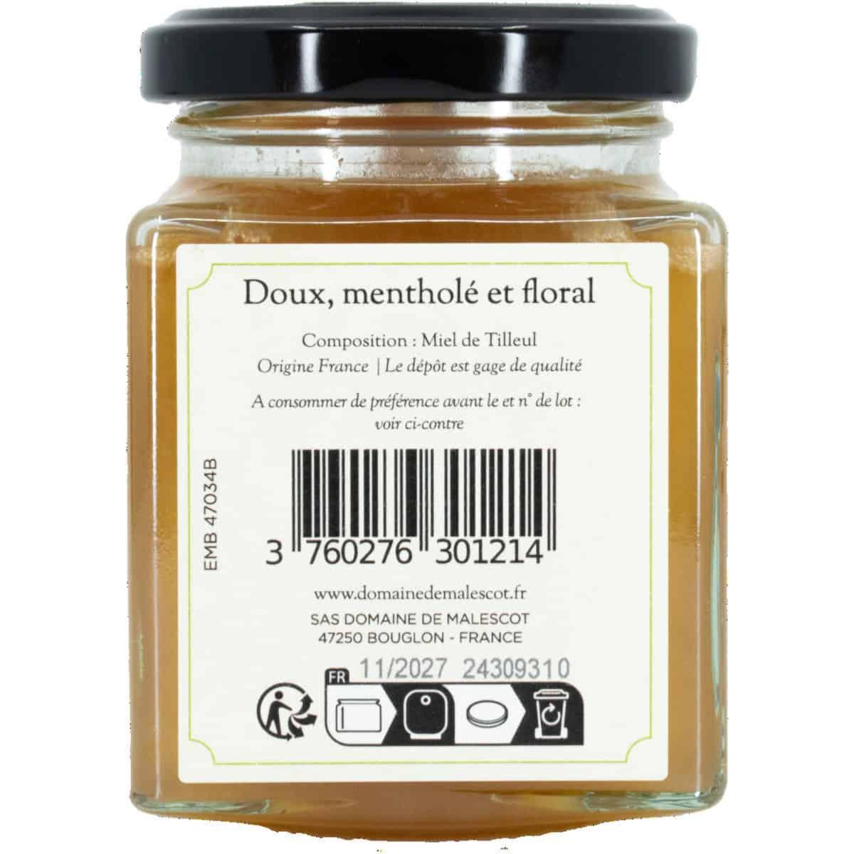 Miel de tilleul de Dordogne certifié BIO récolté par Les Abeilles de Malescot. Pot de 250 g.